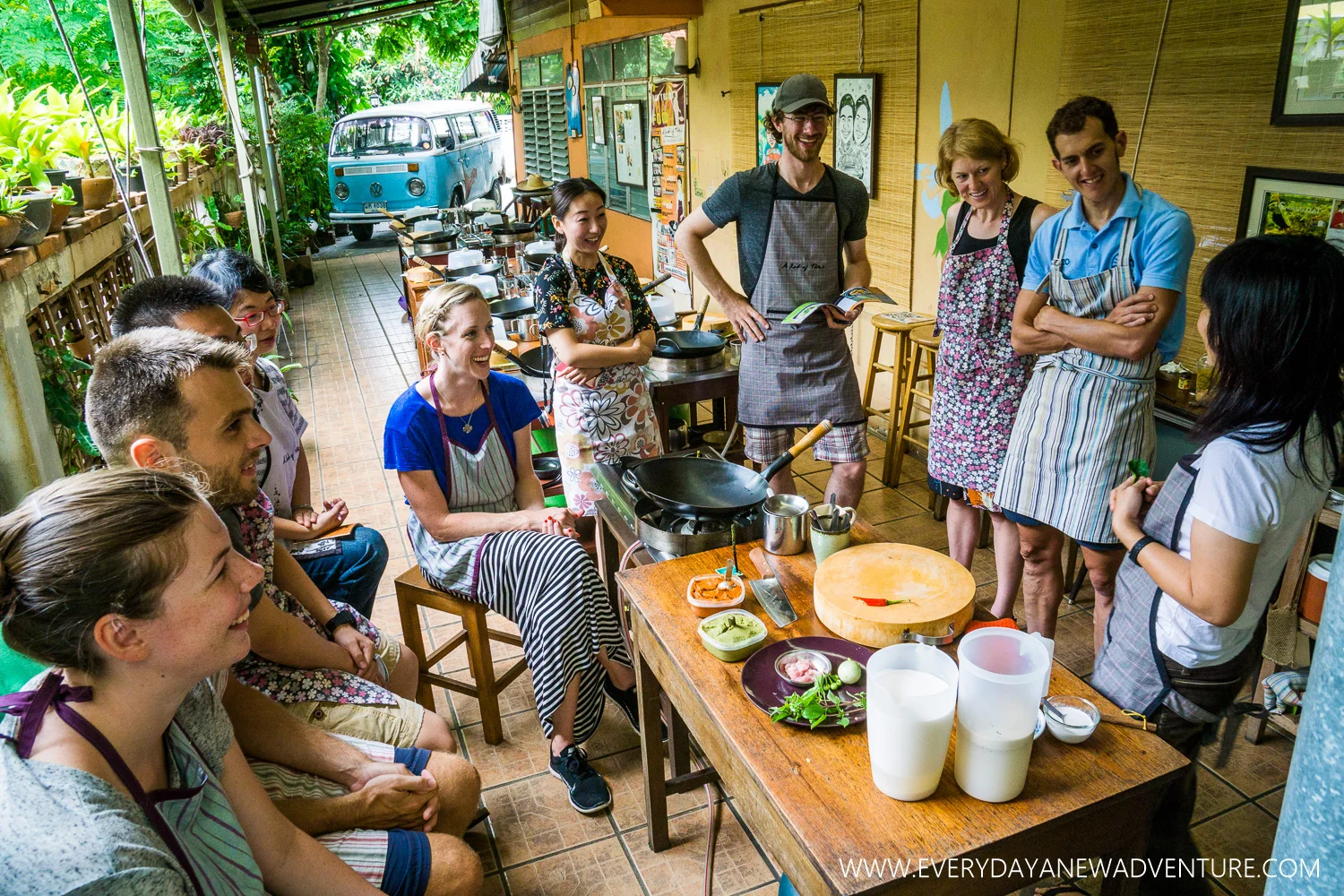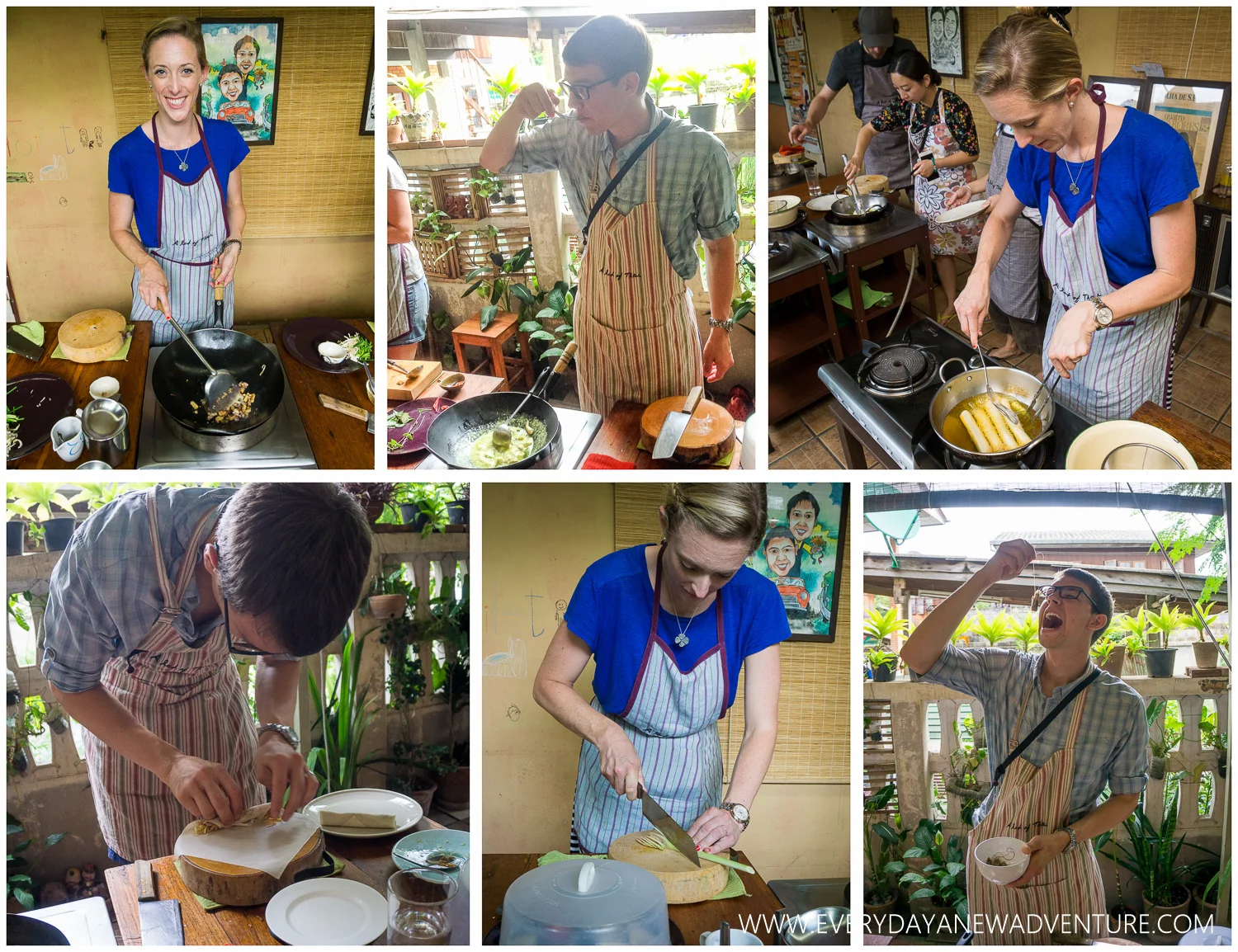 Because we love food culture so much, it would make sense that one of our big activities in the city revolved around learning about food! One morning we were picked up by a baby blue 1974 VW van and whisked away to another part of Chiang Mai for al all day cooking class with Yui! Yui, a TV chef, and her husband, Kwan, have been running their business, A Lot of Thai cooking classes, since 1999 out of their house where three generations of their family still lives together. The class is small, only 8 people, and held on the covered patio where professional stations are set up for each student - big gas burners, woks, large square surfaces for prep, and tamarind cutting boards. We met our fellow students - a couple from Melbourne who is cycling around Southeast Asia, a couple from Beijing who were just in Chiang Mai for the weekend (she is a food critic/writer at home), a girl from Taiwan who was traveling by herself for a week (she might be the cutest, most shy, most polite person I've ever met), and a recent college grad from New York who was traveling around the world for a few months before starting work in October. It was truly incredible to be in class with such an international group! And I love, most of all, that what brought us all together was our love of food, and our desire to learn about and interact with the local culture.