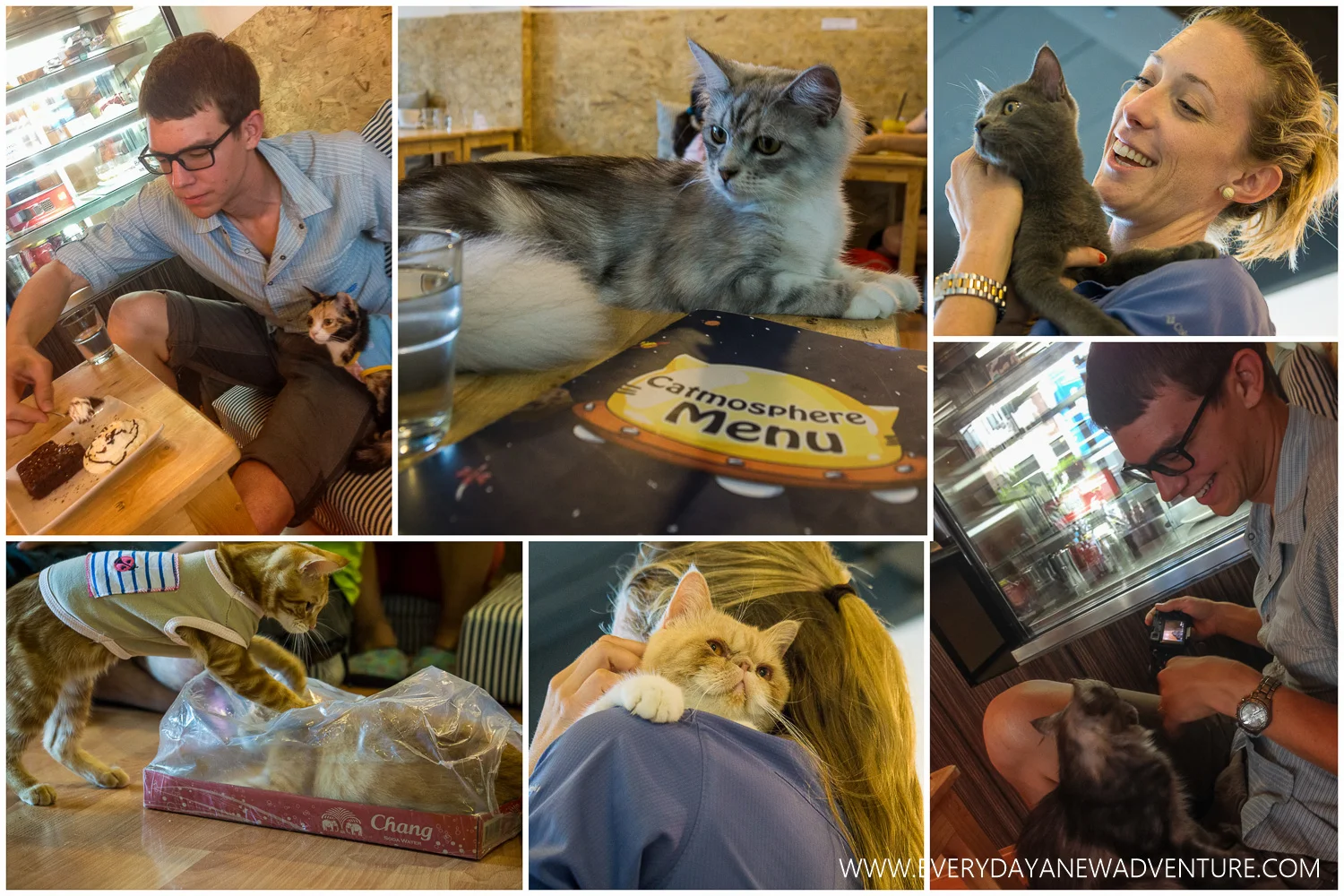 According to Trip Advisor, one of the best "night spots" and coffee shops in the area is over near the university, and it's called…wait for it…Catmosphere! And yes, whatever you think that means is correct - the coffee shop is also home to 19 gorgeous cats that patrons can play with! This was just too good to pass up - I love cats, Jake (the International Cat Whisperer) deep down loves cats (of course he won't admit it though), and it’s a hilarious idea, so we had to check it out! And boy oh boy, it was everything I wanted! As we approached the establishment, we were asked to take off our shoes and wash our hands (ensuring the health of the kitties), and then they sanitized our hands again when we walked through the door. I appreciate the great care they took in order to ensure that guests hands are clean before touching the animals. The place itself was actually very clean, too; no cat hair anywhere on the floor that I could see! I was in awe from the moment we walked in - gorgeous cats were everywhere! Sleeping, eating, playing, entertaining other patrons. We sat down on cushions next to a table where a large grey and white long haired kitty named Jean Luc was lounging and ordered a Thai iced tea and a brownie - we really only came for the cats, but we felt that we needed to buy something too. And I'm glad we did, it was all quite delicious! Jake made friends with a little sweater-wearing kitty cat named Leeloo, appropriate since one of his favorite movies is The Fifth Element. She sat with him and inspected our brownie. I was busy cuddling with a little orangey guy with a smushed face called Cooper. According to one of the employees, he loves to be held. The moment I scooped him up he snuggled right under my chin and went to sleep. He was too darn cute and I wanted to smuggle him out of there in my purse, but I thought better of that idea and left him with his friends. That was definitely a worthwhile hour! And bonus - next door was a place called S'more Café, so naturally we stepped in there before carrying on our way to enjoy a frozen hot chocolate topped with marshmallows and chocolate sauce. Yum.