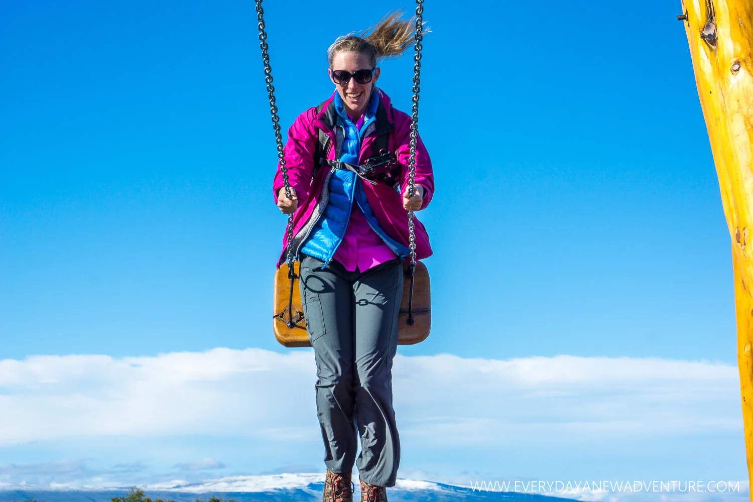 Having fun on the swings by the lake in El Calafate.